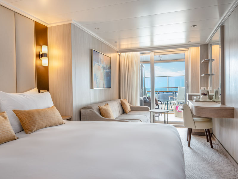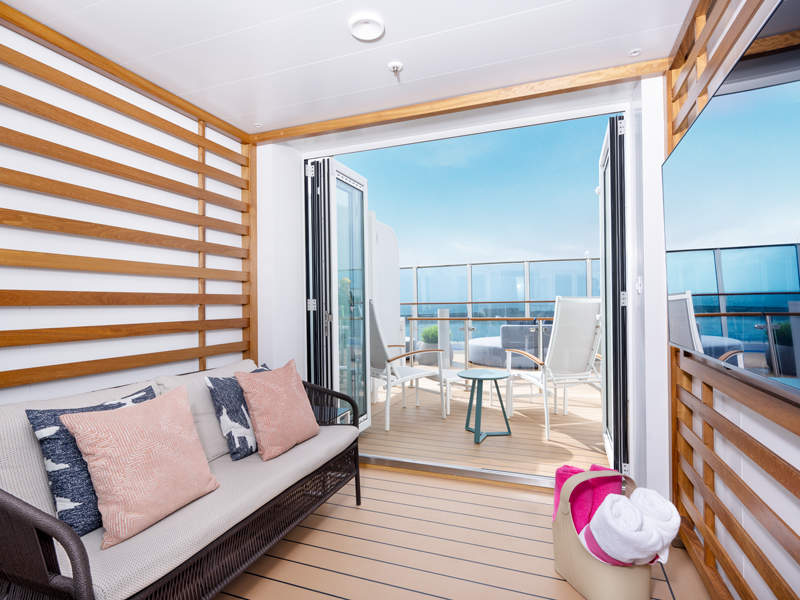 Diese inspirierte Kabine bietet den zusätzlichen Luxus eines grossen privaten Balkons – der perfekte Ort für einen Cocktail vor dem Abendessen oder ein entspanntes Frühstück.